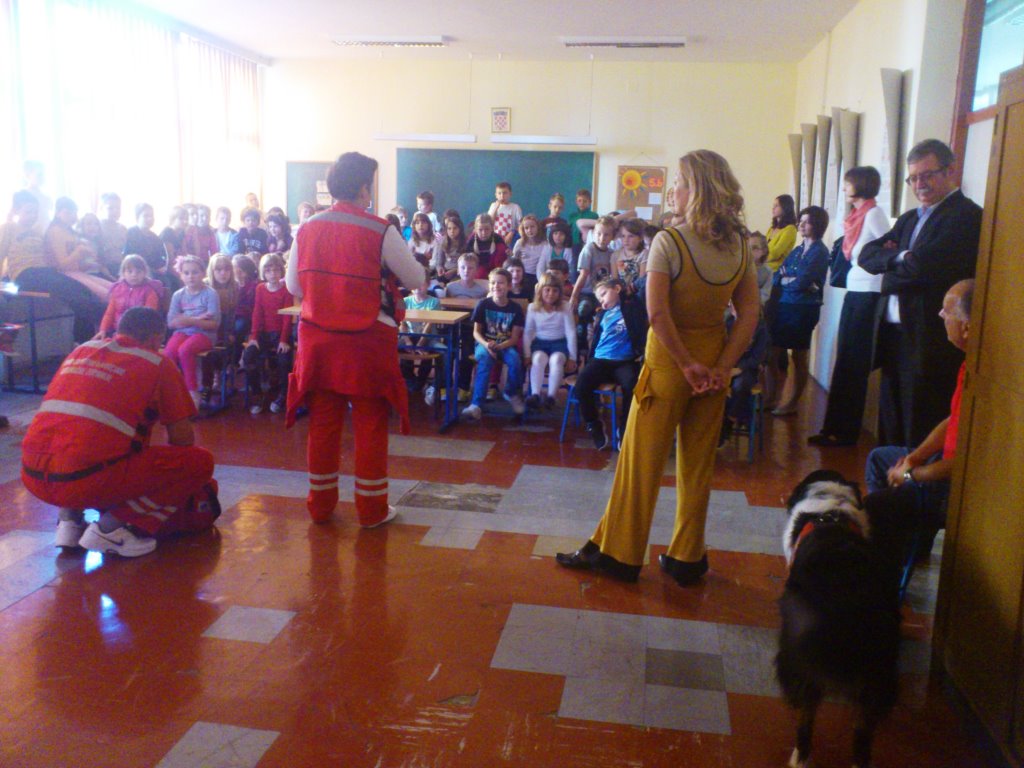 Učenicima prvih i drugih razreda je prezentacijom prikazano spašavanje u slučaju požara, poplave i potresa. Nakon toga su predstavnici Javne vatrogasne postrojbe, Hitne medicinske pomoći, prometne policije i Hrvatske gorske službe spašavanja s potražnim psom Melom upoznali učenike s načinom rada i opremom koju koriste tijekom žurnih intervencija.