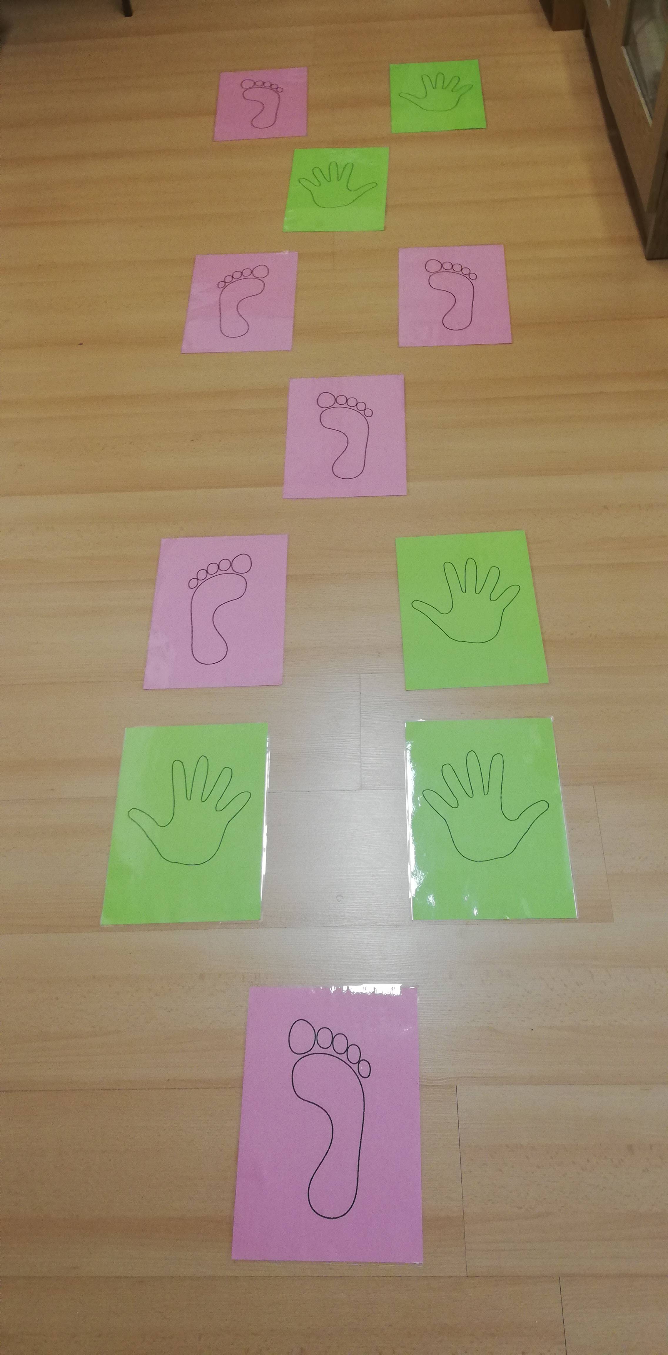 Na papiru napravite obris svojih stopala i ruku. Papir plastificirajte ili oblijepite da se ne uništi. Postavite papir na pod po želji te pratite shemu svojim rukama i nogama.