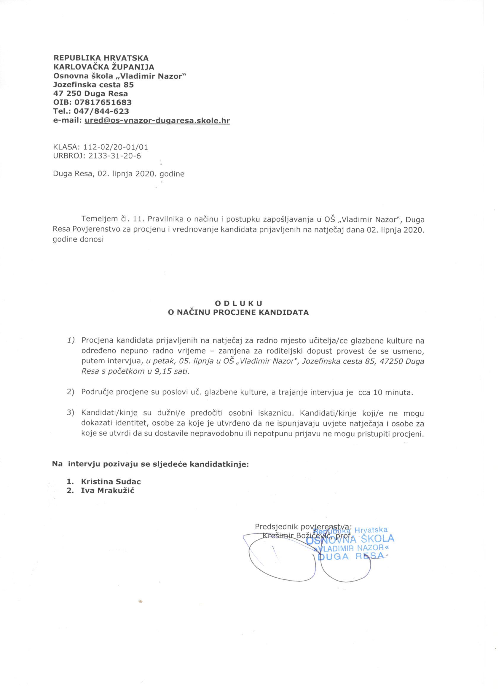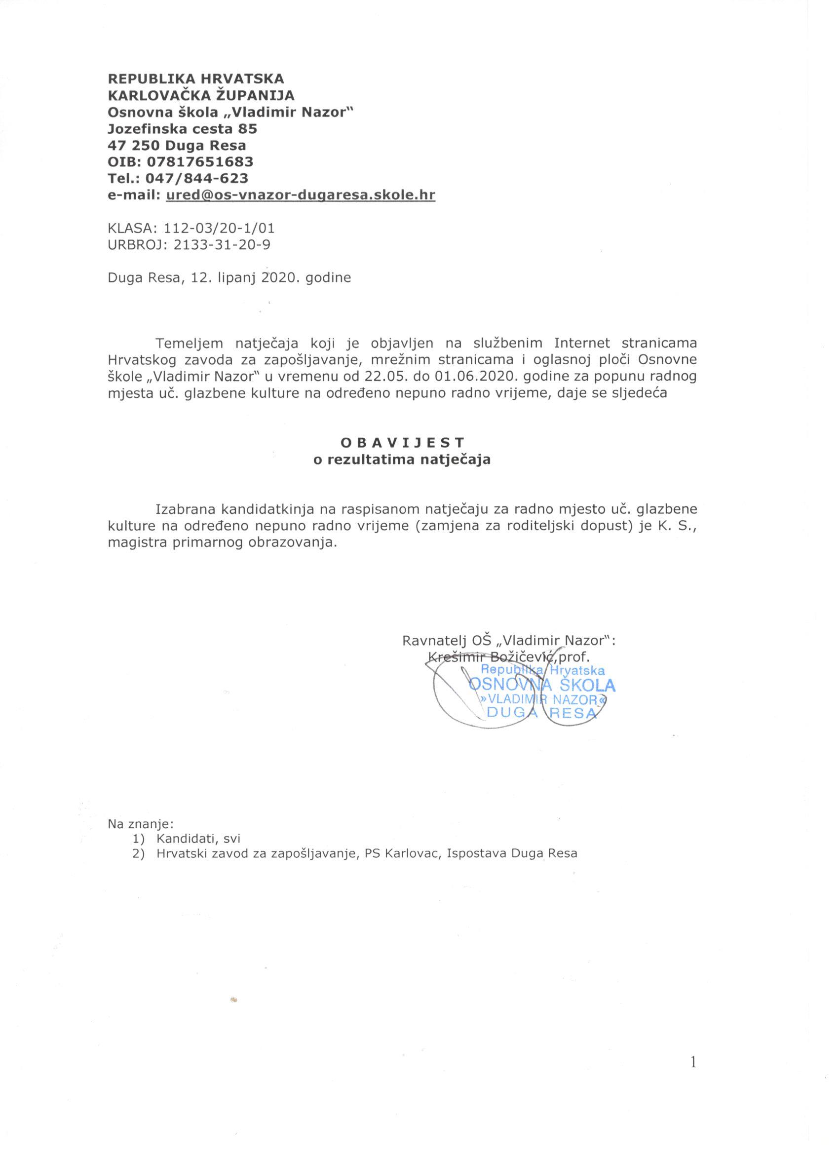 Temeljem članka 107. Zakona o odgoju i obrazovanju u osnovnoj i srednjoj školi („Narodne novine“, br. 87/08., 86/09., 92/10., 105/10., 90/11., 16/12., 86/12., 126/12., 94/13., 152/14., 07/17., 68/18. i 98/19.) i u skladu sa Pravilnikom o načinu i postupku zapošljavanja u OŠ „Vladimir Nazor“ ravnatelj Osnovne škole „Vladimir Nazor“, Duga Resa, Jozefinska cesta 85, dana 22. svibnja 2020. godine raspisuje: