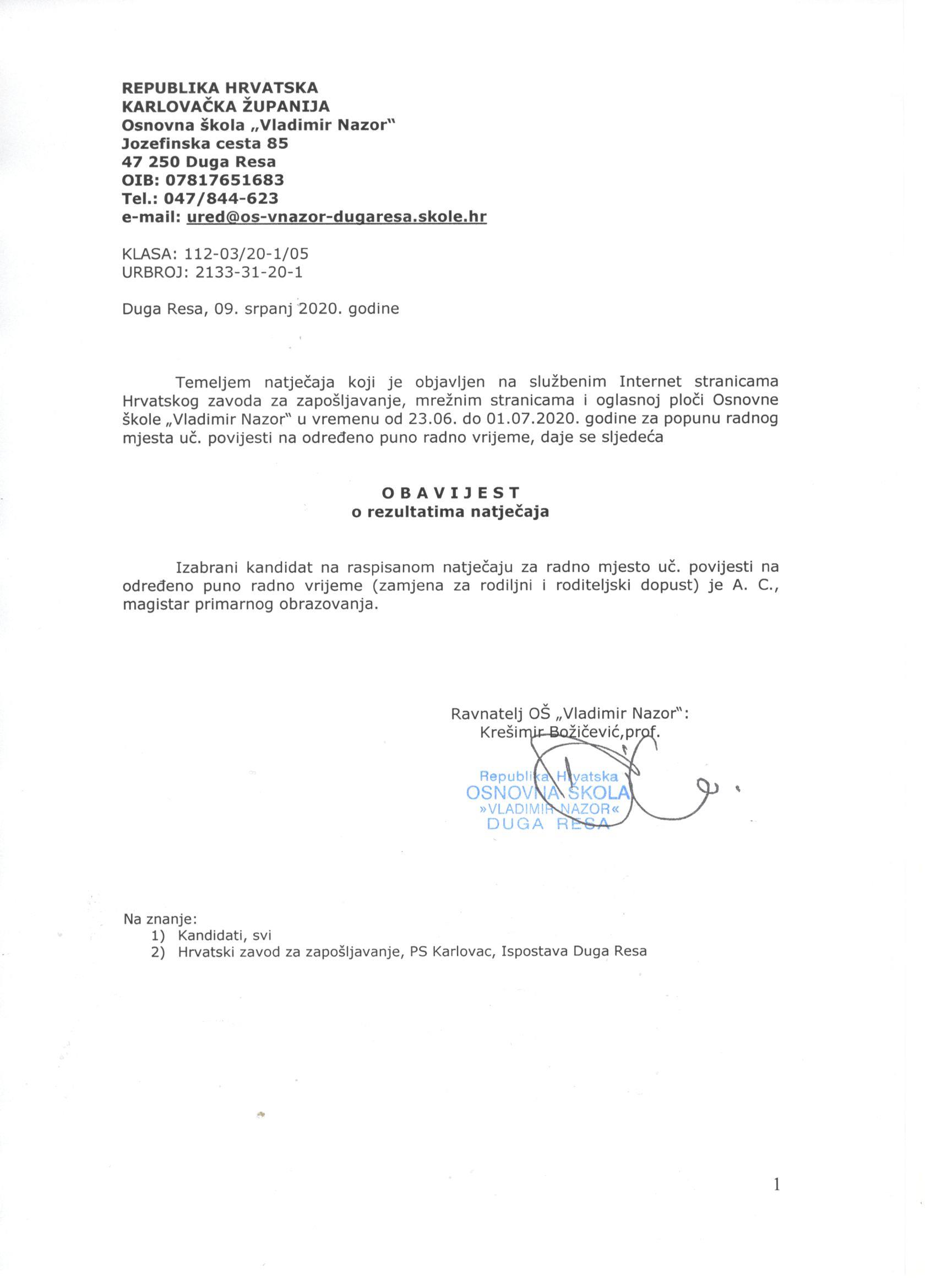 Obavijest o rezultatima natječaja za radno mjesto uč.povijesti