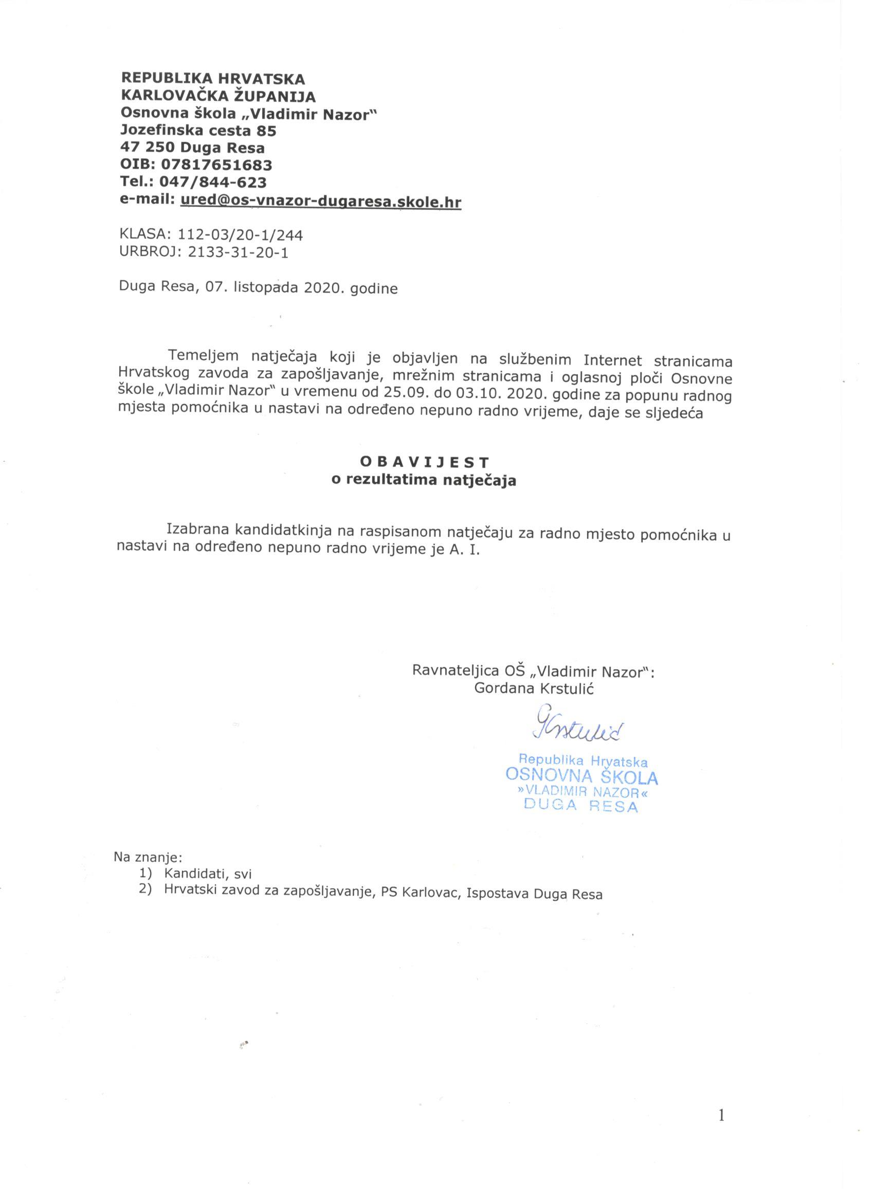 Obavijest o rezultatima natječaja za pomoćnika/ice u nastavi