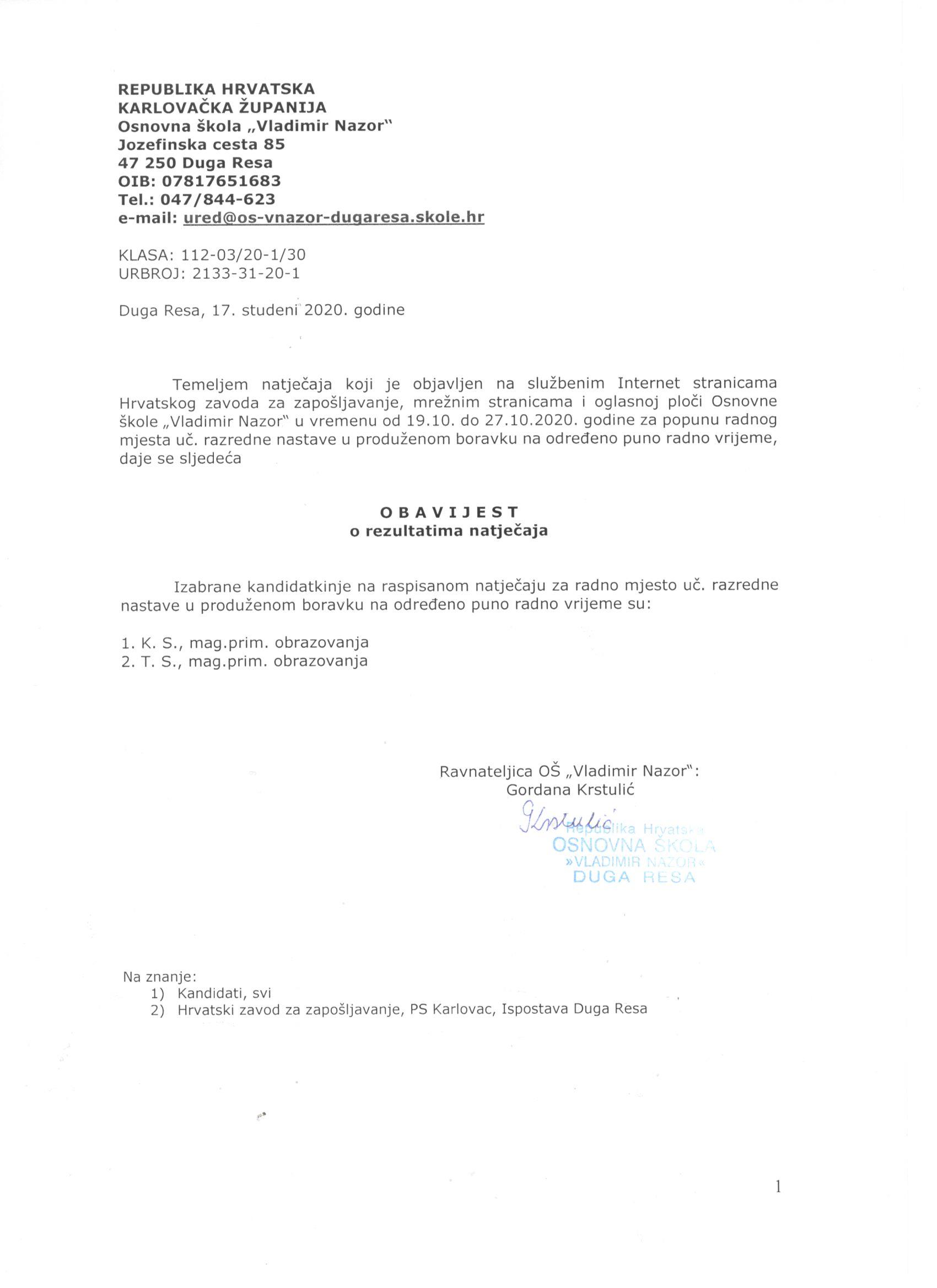 Obavijest o rezultatima natječaja za radno mjesto učitelja/ice u produženom boravku